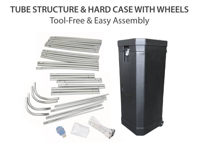 The Package also includes a Custom Pillowcase Graphic that, if double-sided, can display the same or different artwork on both sides, while creating a top notch display printed with the state-of-the-art technology. Besides our package contains a Hard Case with Wheels to allow a very easy portability.